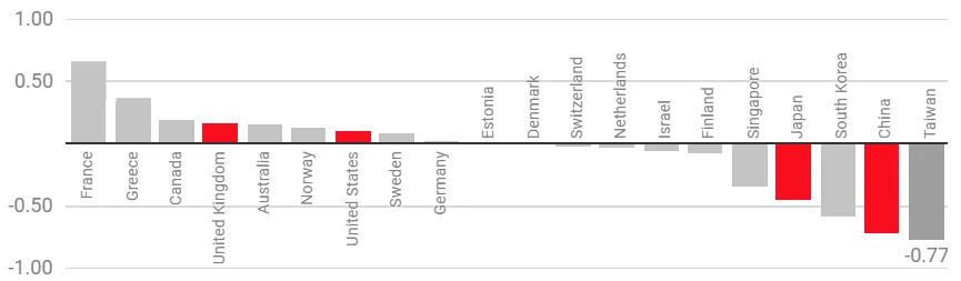 A comparison of countries piloting self-driving cars (closer to 1 = spare the young, closer to -1 = spare the old)[ref]Hao, K. (2018) ‘Should a Self-Driving Car Kill the Baby or the Grandma? Depends on Where You’re from.’ [24 October 2018] available from <https://www.technologyreview.com/s/612341/a-global-ethics-study-aims-to-help-ai-solve-the-self-driving-trolley-problem/>[/ref][/caption]Although China and Japan came to the same agreement in the case of sparing elderly population over the young, they had completely different rights when choosing between saving the pedestrians over the driver. From two neighbouring countries, Japan was more keen towards protecting the pedestrians, whereas China took the alternative option.