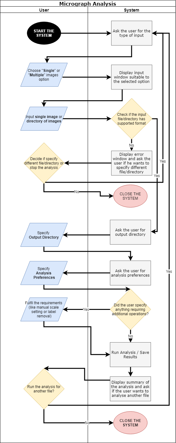 Section titled “Design”The simplified working of the system (presented in this graph) reassembles the waterfall model with several loops in between, which check the input support, allow the user to verify the segmented particles and provide the option to run multiple analysis without opening the script separately for a single run. Because of many operations required to represent the entire system, the following workflow has been simplified for the reason to facilitate the system understanding. Additionally, the Micrograph Analyser workflow has been described in depth with user manual, video tutorials and in-code description using programming comments.