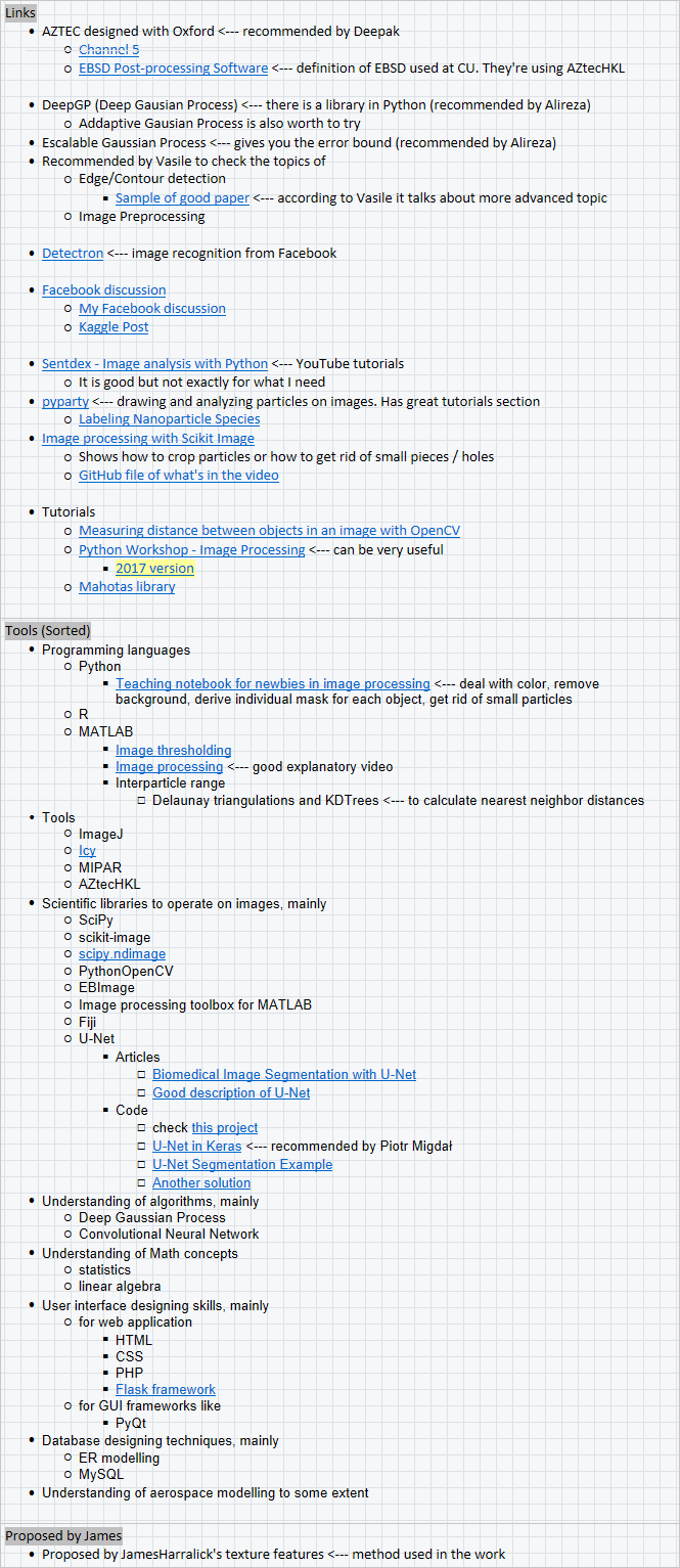 Section titled “Initial investigation”My OneNote notebook was continuously fed with new information, and I was thinking where will I get the time go through all the resources. In the end, my “tools” section looked somehow like this. The arsenal of tools is vast and definitely not fulfilled; however, it contained the most promising options. Feeling under pressure, I sought for tips from the experts of Data Science on the Facebook group by raising a discussion. The answers I received, got their use in my work as I understood that I was looking towards a right direction with the previously scribbled set of tools.