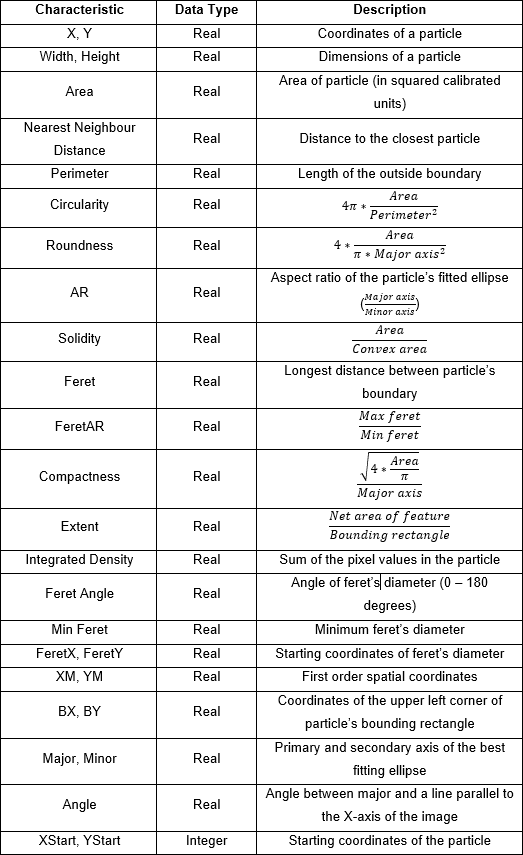 Later, on a successful analysis, the output data about each of the particle has been summarised in this table. Most of the data is saved in calibrated units, like μm. The bottom part of the .csv file summarises entire data with minimum, maximum, mean value and standard deviation.