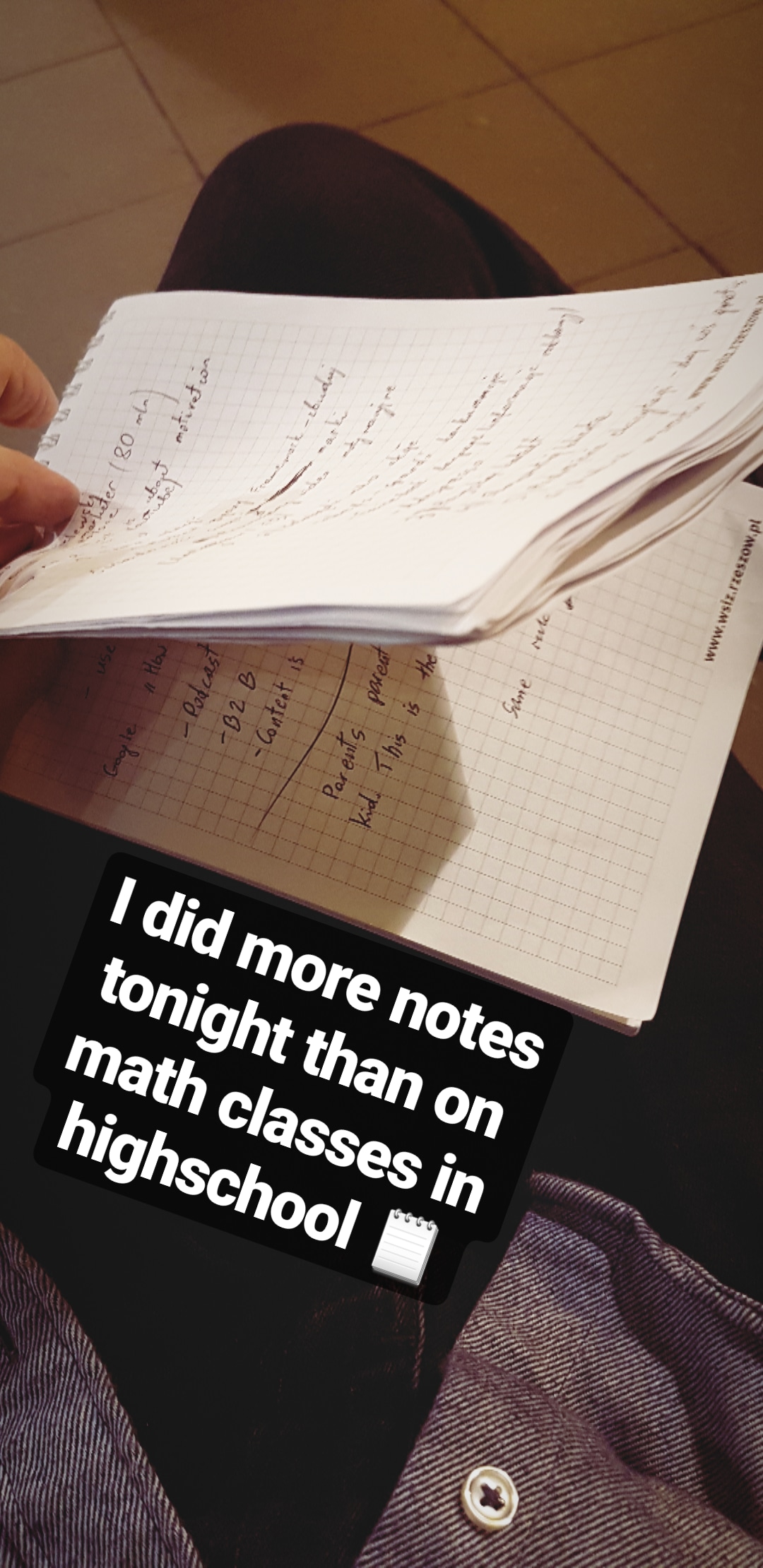 In the thumbnail/background image of this post, you may have noticed the term “World Business Experience (WBE)”. Sounds intriguing, but what is it? Three days ago (27/09/2018) I have attended the all-day conference in Warsaw (🇵🇱), that did cost a little bit (~208 €), but just as every attendant, I will never regret spending any money for that time. The main star of the WBE was no one else but Gary Vaynerchuk who was preceded with dozens of different stories from other business winners. All of the presenters were so great that I had come home with a quite considerable pile of notes (pic), that I am trying to digitalise here, leaving the most fundamental framework.