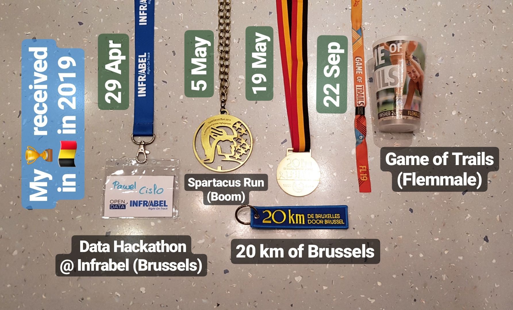 - Here are all my medals for the 3 runs I took this year in Belgium (+ a batch from a Data Hackathon at Infrabel)
